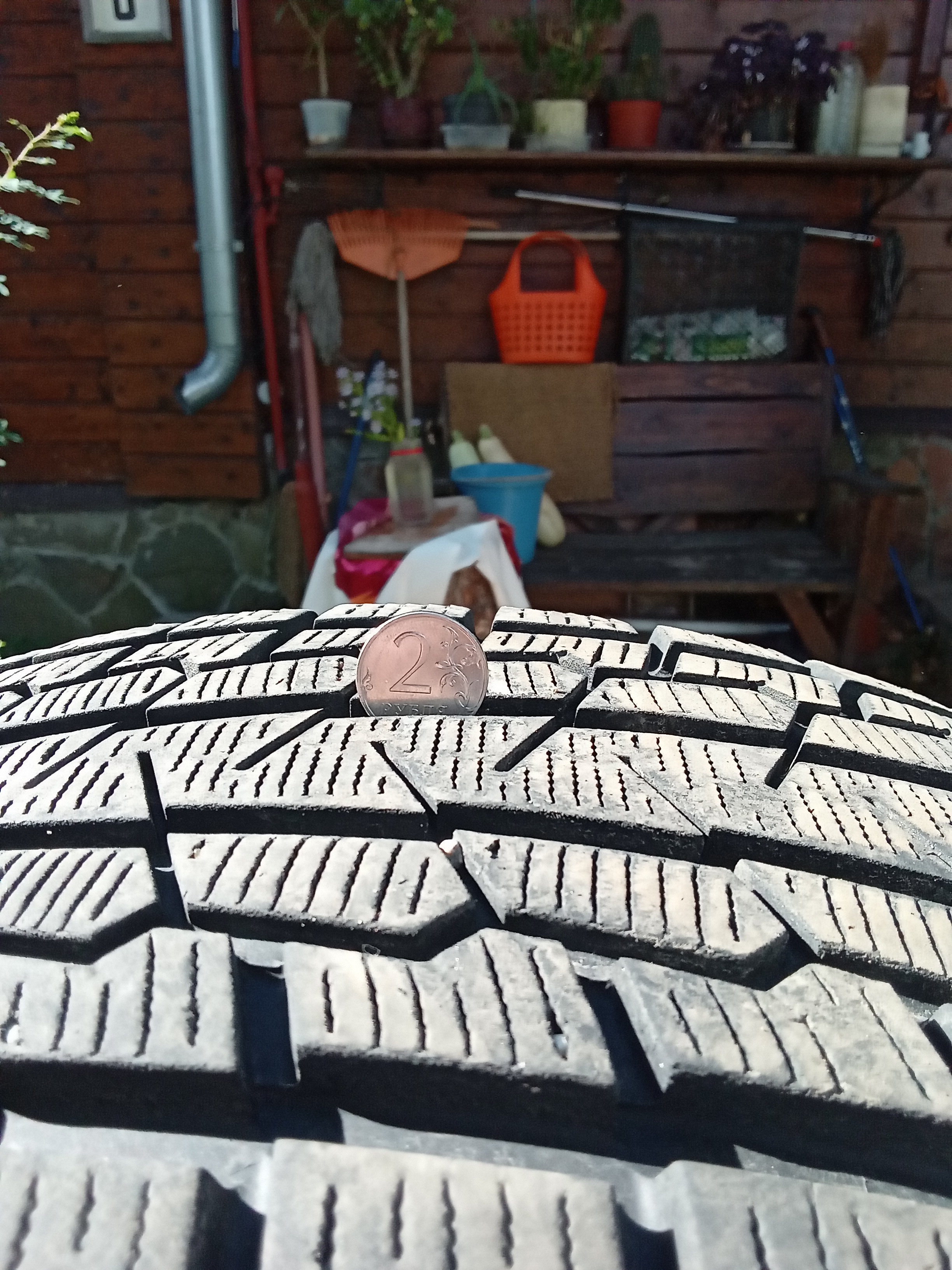 Резина в отличном состоянии. Пробег две зимы. Мягкая. Заплаток, порезов, грыж нет. Остаток на фото. Примерно 6мм. Может и больше.