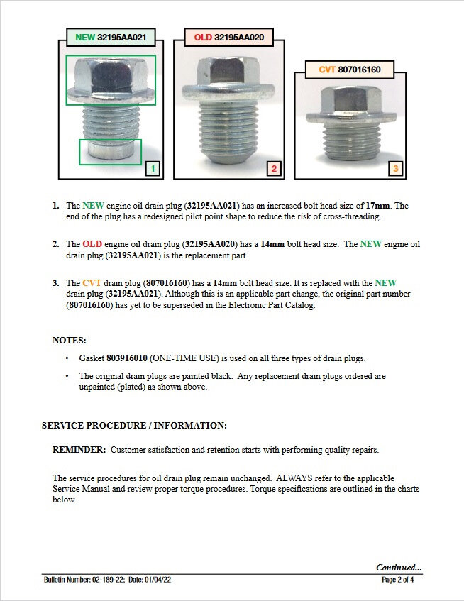 1. The NEW engine oil drain plug (32195AA021) has an increased bolt head size of 17mm. The end of the plug has a redesigned pilot point shape to reduce the risk of cross-threading.