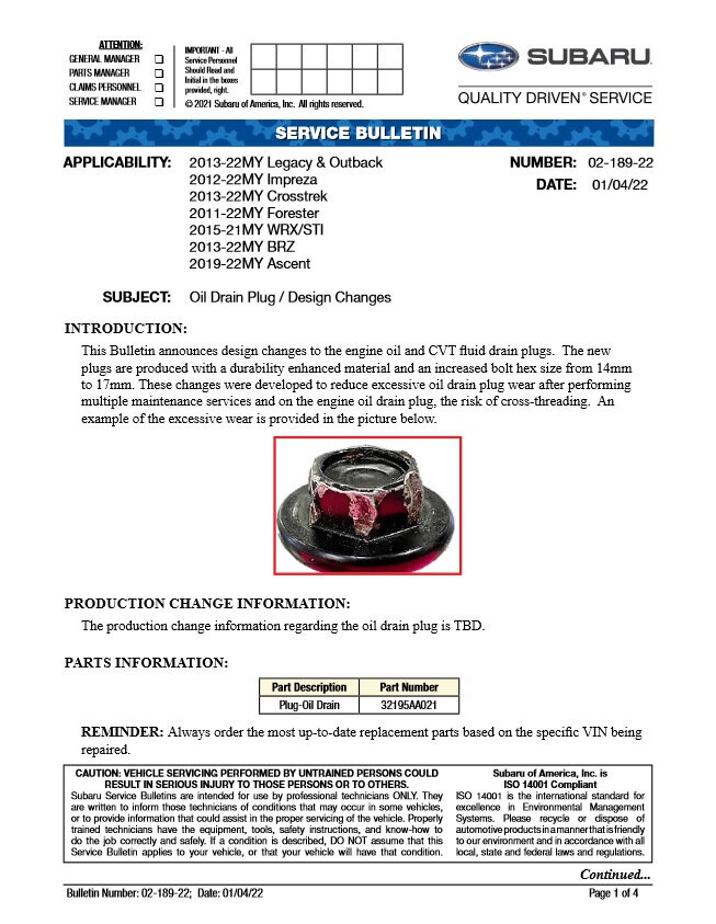 2. The OLD engine oil drain plug (32195AA020) has a 14mm bolt head size. The NEW engine oil drain plug (32195AA021) is the replacement part.