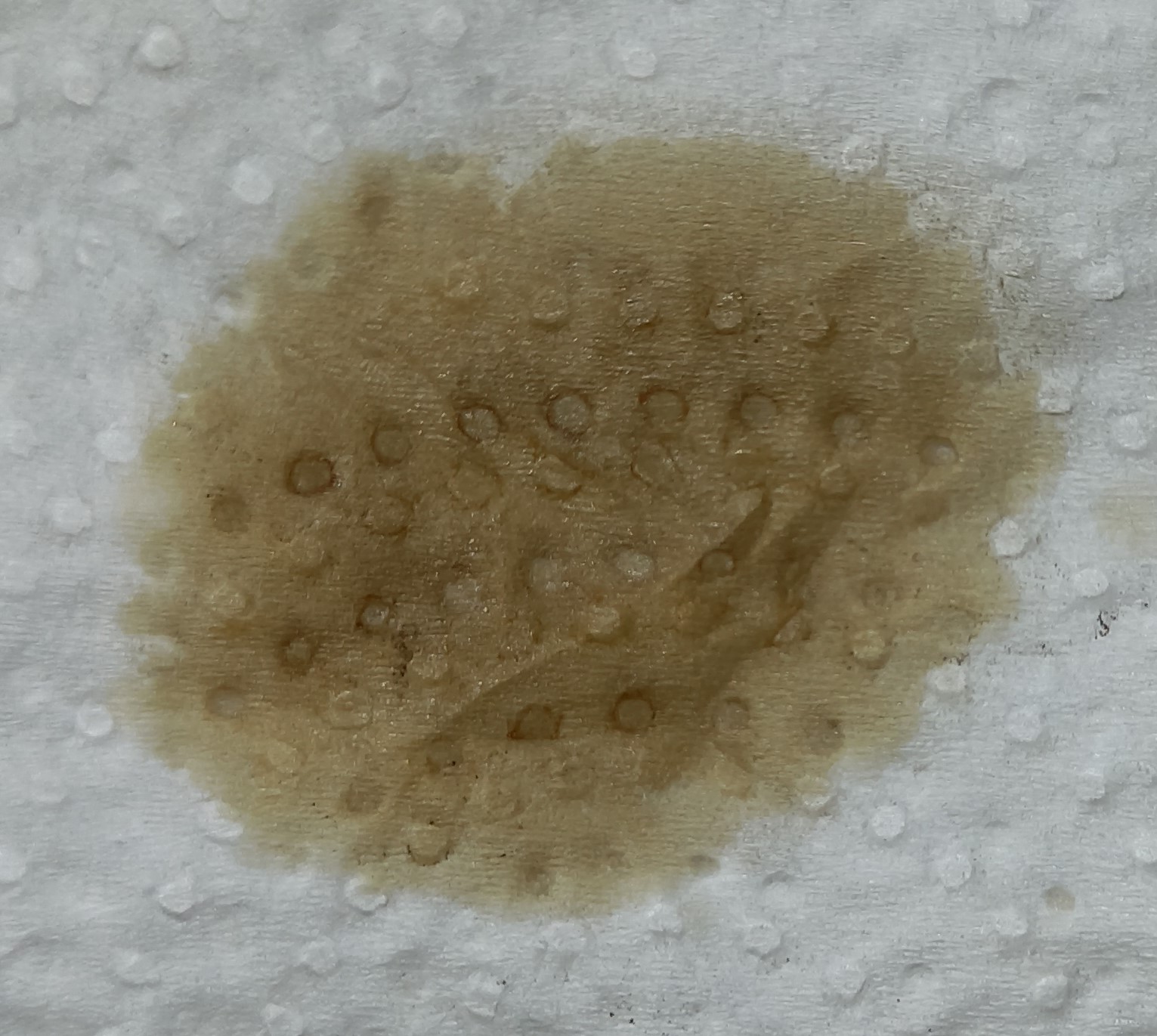 Цвет масла- масло немного потемнело, но равномерно прозрачное, пятно на бумаге одного цвета и плотности, светлое, равномерно растекается.