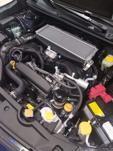Мотор FA24 турбовый полнофазный, 2.4 литра (ну наконец-то). Кулер топмаунт, визуально больше чем сти грб, раза в полтора больше чем на FA20DIT. 275 сил/350 момента, максимальный момент полкой 2000-5200. Для города- очень круто.